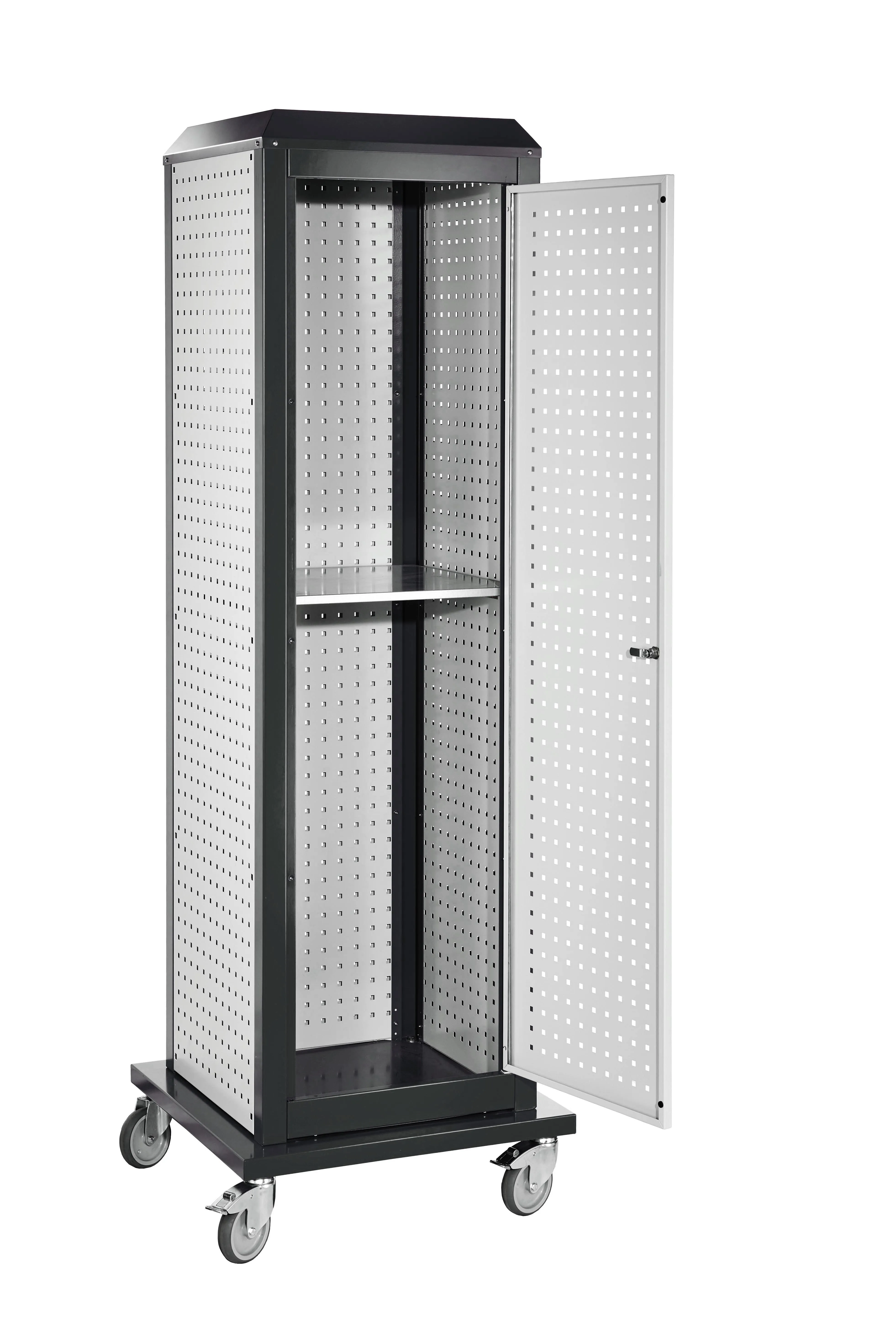 Die Variante mit abschließbarer Tür ermöglicht eine vollständige Nutzung des Innenraums, der zusätzlich mit weiteren Lochplatten oder Fachböden konfiguriert werden kann. Dies gewährleistet eine sichere und organisierte Aufbewahrung.
